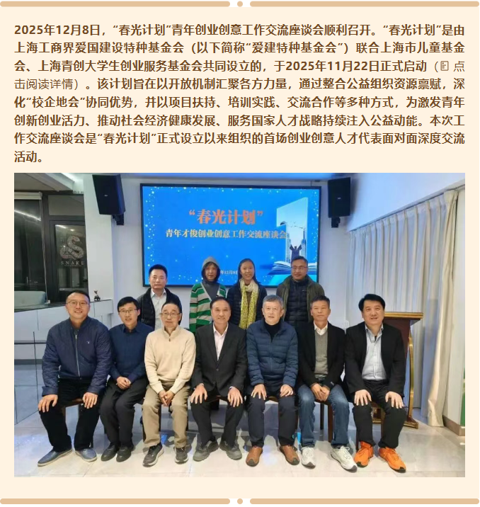 针对更好发挥“春光计划”的平台纽带作用,尽快推动形成公益赋能青年创业创意的实际举措和成果转化,范永进理事长强调要在以下三方面积极“行动”:一是建立健全工作例会机制,明确例会召集人,不定期组织开展青年创业创意交流,可按工作需要组建顾问团、创业团、讲师团、游学团、公益团等,以此有序推进各项工作落地;二是要聚焦项目、活动、产品、作品等,立足小而优、小而精、小而乐,打造出可复制、可持续的公益精品,并要注重展现自身特色,形成良性循环;三是通过“春光计划”项目实践,不断加强政、商、学三界互动融合,持续通过项目“出思路、出成果、出人才”,实现公益慈善服务支持有效链接青年群体成长需求,进而形成良好的社会效应、经济效应和学术效应。