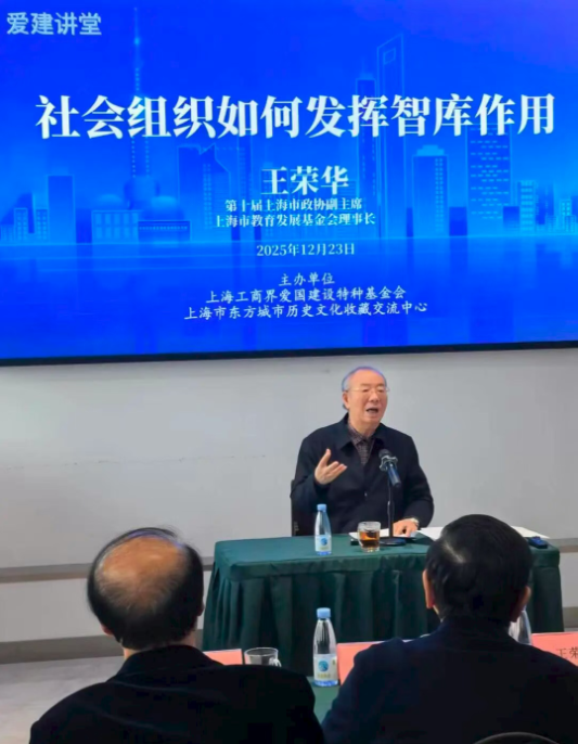 2025年12月23日,由上海工商界爱国建设特种基金会(简称“爱建特种基金会”)与上海市东方城市历史文化收藏交流中心联合主办的“爱建讲堂”第三讲正式开讲。活动特邀智库专家王荣华等,带来主题为“社会组织如何发挥智库作用”的精彩演讲。