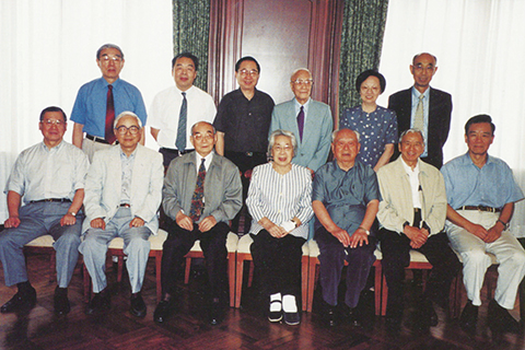 2002年9月21日,爱建特种基金在成立十周年之际,郭秀珍理事长(前排中)邀请上海市委、市政府老领导杨堤(前排右二)等在锦江饭店欢聚。前排左起:庄晓天、叶公琦、杨延修、郭秀珍、胡立教、杨堤、沙麟