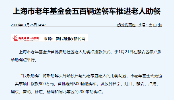 我们老年基金会还有一个比较重要的项目就是建立老人食堂,为社区困难老人提供餐饮。过去由于没有场所等原因,老人食堂是很少的,不少社区解决老年人用餐主要是靠送餐车送到老年人的家里,或者老年人活动点,或者老年人服务中心。我们就用爱建特种基金会捐赠的钱购买了部分送餐车,下发到各个社区,帮助老年人解决用餐困难。当然还有其他项目,爱建特种基金会近30年来给老年基金会所捐赠的资金,对于解决老年人特殊困难,改善老年人的晚年生活,都作出了很大的贡献。