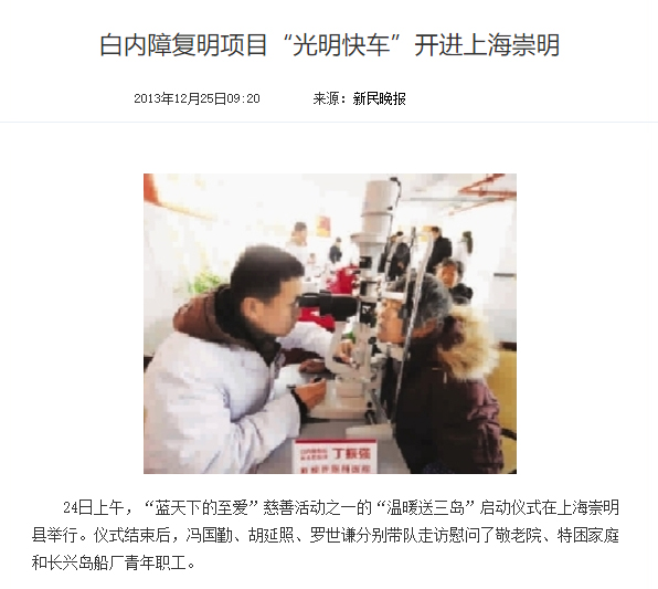 上海市老年基金会用爱建特种基金会捐助的资金帮助困难老人治疗白内障
