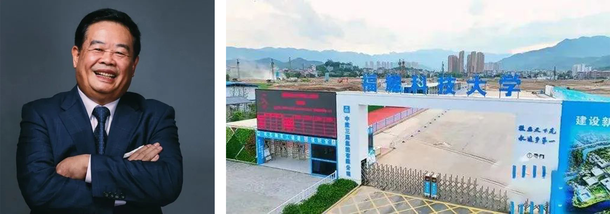左:曹德旺,右:建设中的福耀科技大学