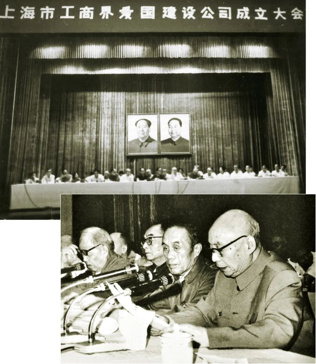 1979年9月22日,上海市工商界爱国建设公司成立大会在上海展览馆举行,右起刘靖基、唐君远、杨延修等领导在主席台就坐